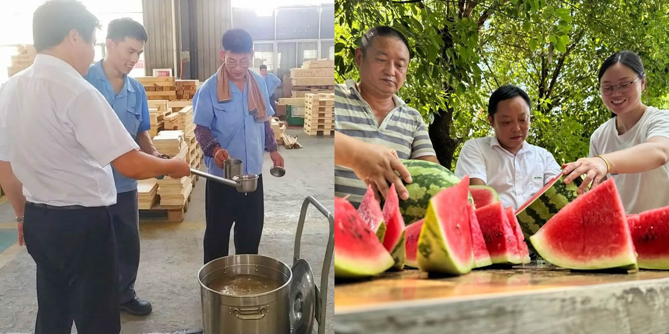 前程公司歷年來,每逢高溫都會在每個(gè)車間配備藿香正氣水、鹽汽水、冰紅茶等飲料供員工隨時(shí)自取,公司食堂也推出清爽不油膩的“夏季專屬”菜品,并每天提供綠豆粥。另外,公司行管代表也齊上陣為一線員工提供“切西瓜送清涼”的人性化服務(wù),把清涼和關(guān)懷送到每一位一線員工的心坎上。
