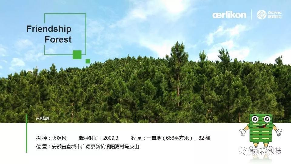 歐瑞康(Wuxi)與前程公司的友誼林位于安徽省廣德市前程?hào)|盛生態(tài)林業(yè)有限公司的林場內(nèi),林場現(xiàn)有土地總面積3000多畝,林場內(nèi)有松樹林、竹林、水庫、茶園、山核桃園等;友誼林占地面積為一畝地(666平方米),82棵松樹,品種為火炬松,寓意著雙方的合作擁有更加美好的明天。
