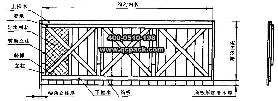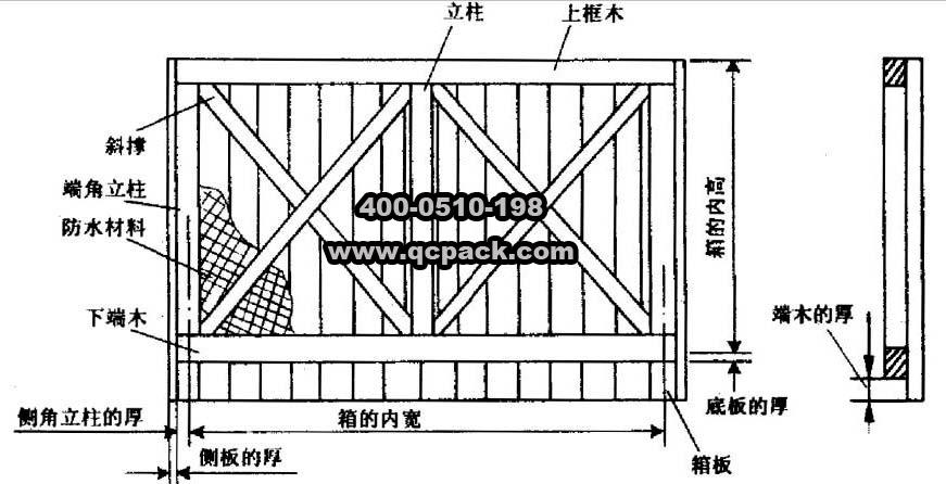 框架木箱的側面(圖6-3)和端面(圖6-4)是由框架、箱板、輔助立柱和梁承組成的??蚣芫褪峭ǔKv的桁架,它的構件有上框木、下框木、立柱和斜撐,較大的框架在上框木與下框木之間還設有平撐。