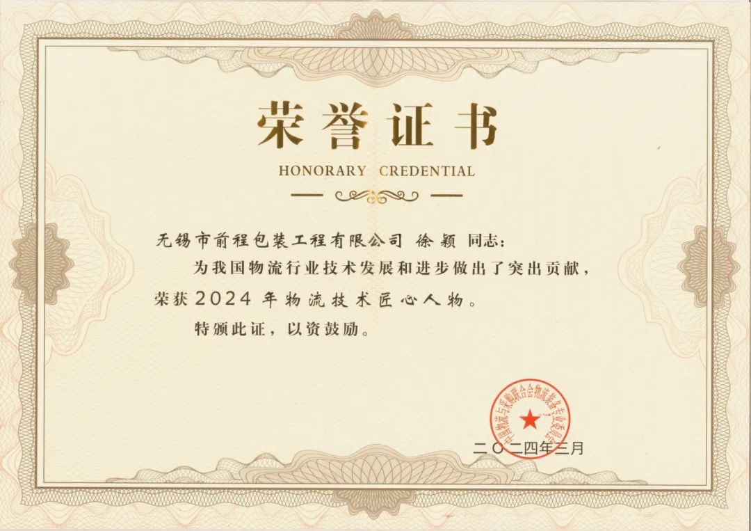 近年來,徐穎總經(jīng)理帶領(lǐng)技術(shù)研發(fā)團(tuán)隊(duì)組建了江蘇省綠色智能包裝工程技術(shù)研究中心,并成功通過省級(jí)工程技術(shù)研究中心認(rèn)定,對我國綠色智能包裝技術(shù)及企業(yè)創(chuàng)新發(fā)展注入新動(dòng)力。通過開發(fā)新的代木材料,幫助客戶努力降低包裝成本,為客戶創(chuàng)造價(jià)值,為減少林業(yè)資源消耗及其他包裝原材料行業(yè)的可持續(xù)發(fā)展作出了積極的努力;通過推進(jìn)循環(huán)包裝及減量化,為新能源、成套裝備、高端醫(yī)療器械等新興產(chǎn)業(yè)助力。公司獲得“創(chuàng)新示范領(lǐng)軍企業(yè)”、江蘇省“專精特新”企業(yè)等多項(xiàng)榮譽(yù)稱號(hào),也收獲了眾多客戶的認(rèn)可和信任。此次,徐穎總經(jīng)理榮獲”物流技術(shù)匠心獎(jiǎng)”亦是行業(yè)對前程公司不斷創(chuàng)新、穩(wěn)健發(fā)展的高度肯定。